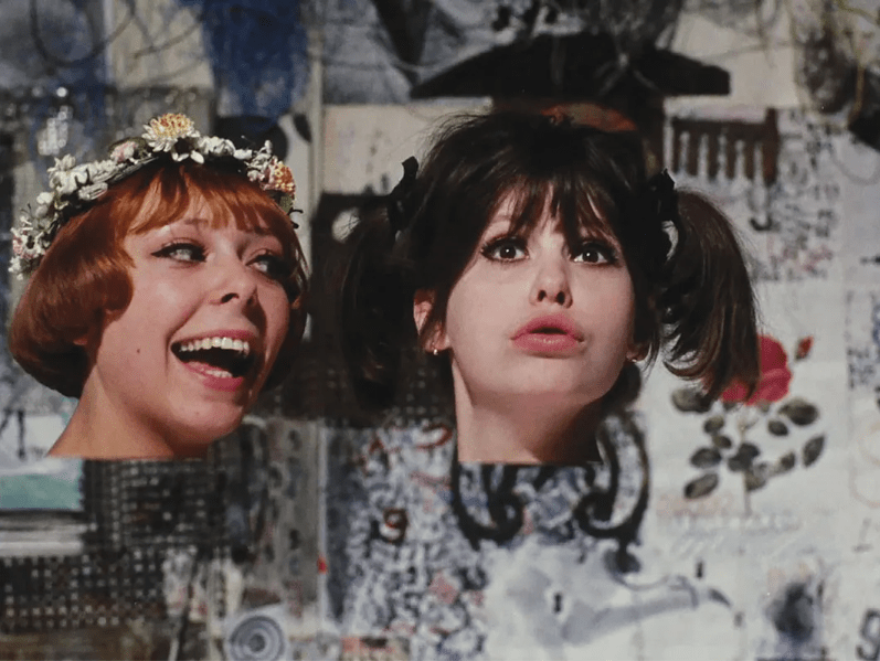 The film frequently shifts between black-and-white and colour, uses surrealist effects, collage-like visuals and abrupt cuts to create a disorienting and chaotic atmosphere. The Maries’ movements are often accompanied by creaking sounds, likening them to dolls or puppets, a metaphor for how society views and controls women.
